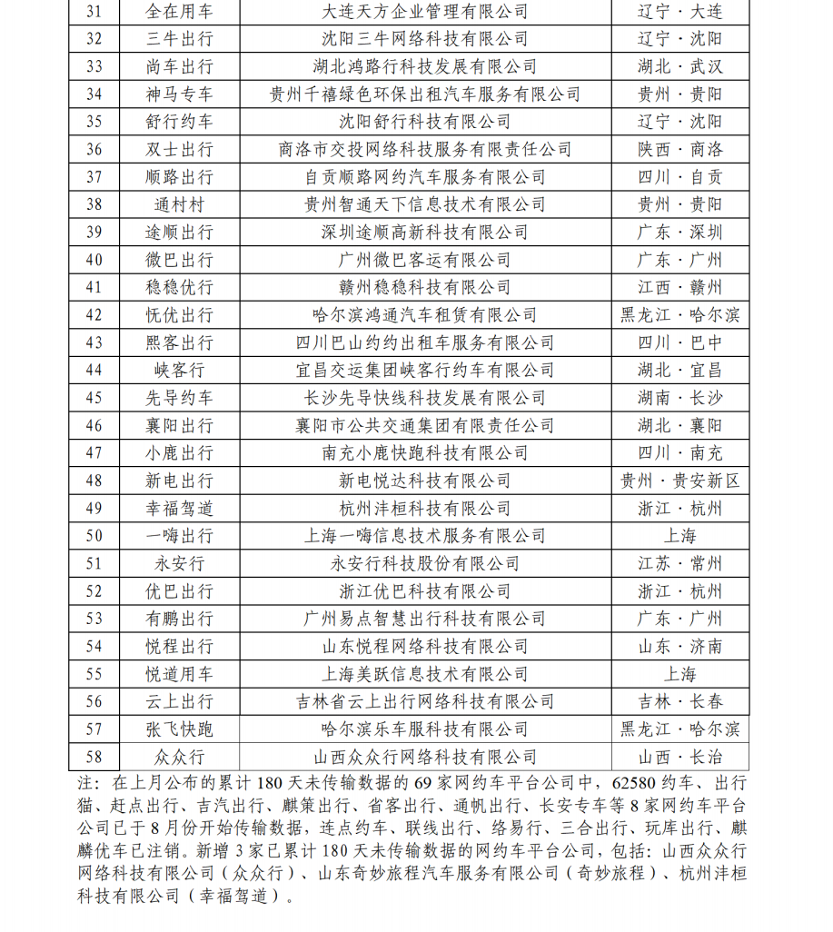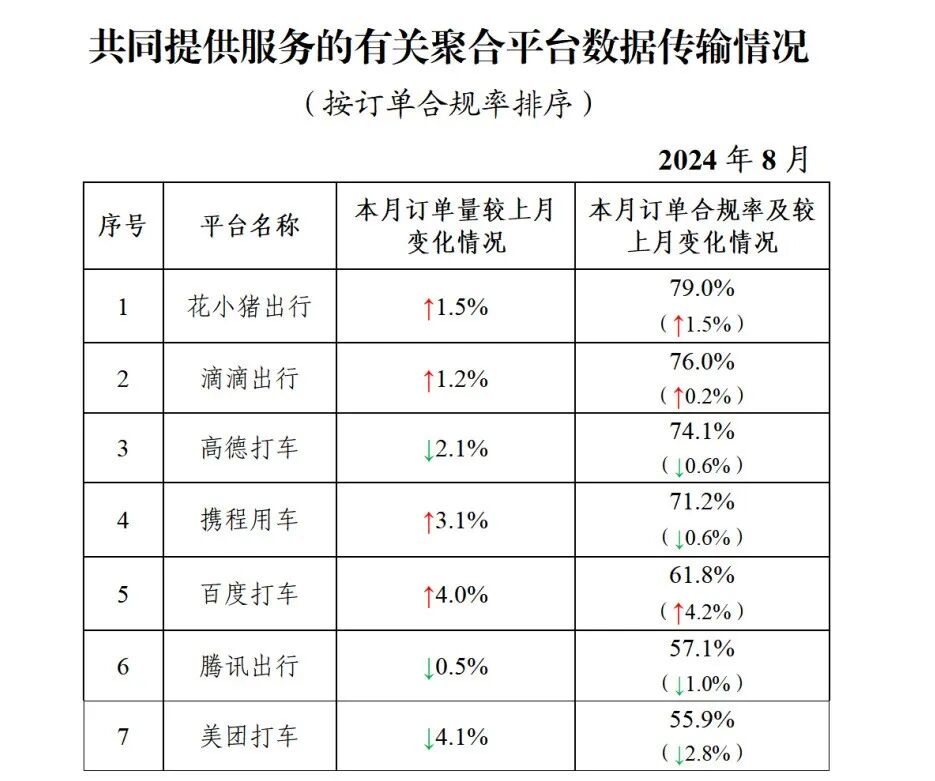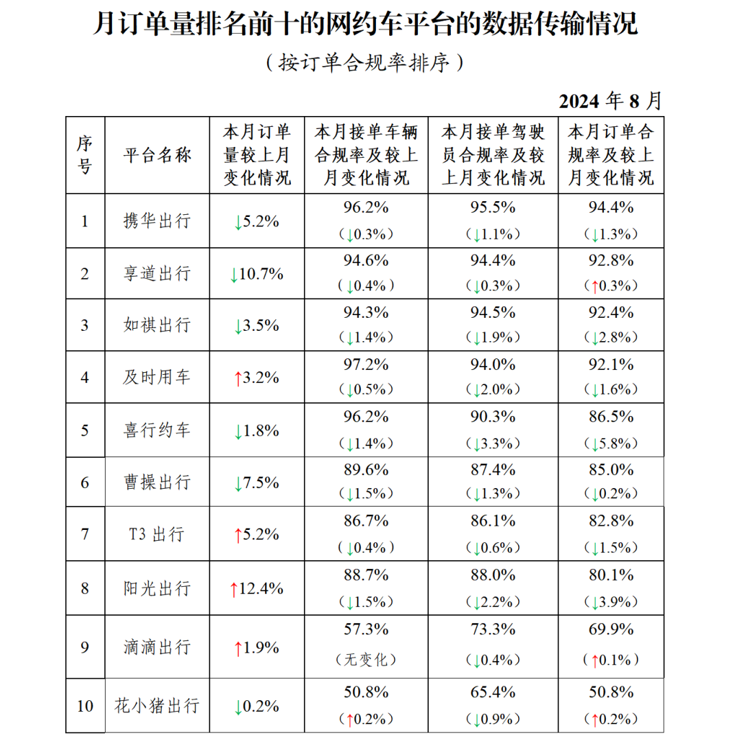 据网约车监管信息交互系统统计,截至2024年8月31日,全国共有359家网约车平台公司取得网约车平台经营许可,环比增加3家;各地共发放网约车驾驶员证729.5万本、车辆运输证310.1万本,环比分别增长1.9%、1.6%。网约车监管信息交互系统8月份共收到订单信息10.29亿单,环比上升1.6%。从本月情况看,有以下特点:一、在订单量前10名的平台中,按订单合规率(指驾驶员和车辆均获得许可的订单量占比)从高到低的分别是携华出行、享道出行、如祺出行、及时用车、喜行约车、曹操出行、T3出行、阳光出行、滴滴出行、花小猪出行。本月订单合规率增长前3名的依次是享道出行、花小猪出行、滴滴出行;增长最后3名的依次是如祺出行(-2.8%)、阳光出行(-3.9%)、喜行约车(-5.8%)。